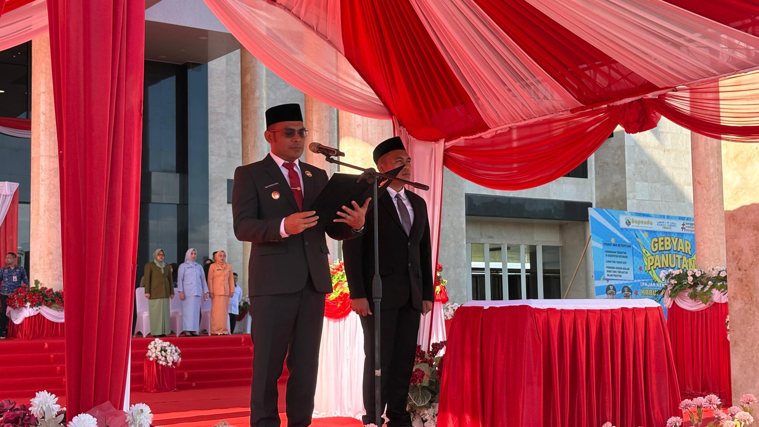 Dalam rangkaian acara, pembacaan Undang-Undang Dasar 1945 dibawakan Asisten Administrasi Umum Setda Kotabaru Selamat Riyadi, naskah ikrar oleh Ketua DPRD Kotabaru Hj. Suwanti, serta doa dipimpin perwakilan Kementerian Agama Kabupaten Kotabaru.